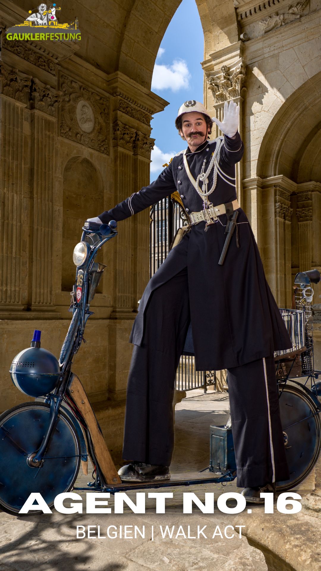 Agent No. 16 reist mit einem lustigen Roller von damals, der mit allem Drum und Dran ausgestattet ist. Die begleitende Musik ist für seine Bewegungen, seinen Ausdruck und sein Verhalten ganz entscheidend. Als Agent No. 16 versucht die Ordnung aufrechtzuerhalten, er tut dies auf sehr spielerische Weise und manchmal mit einem Hauch von Romantik.